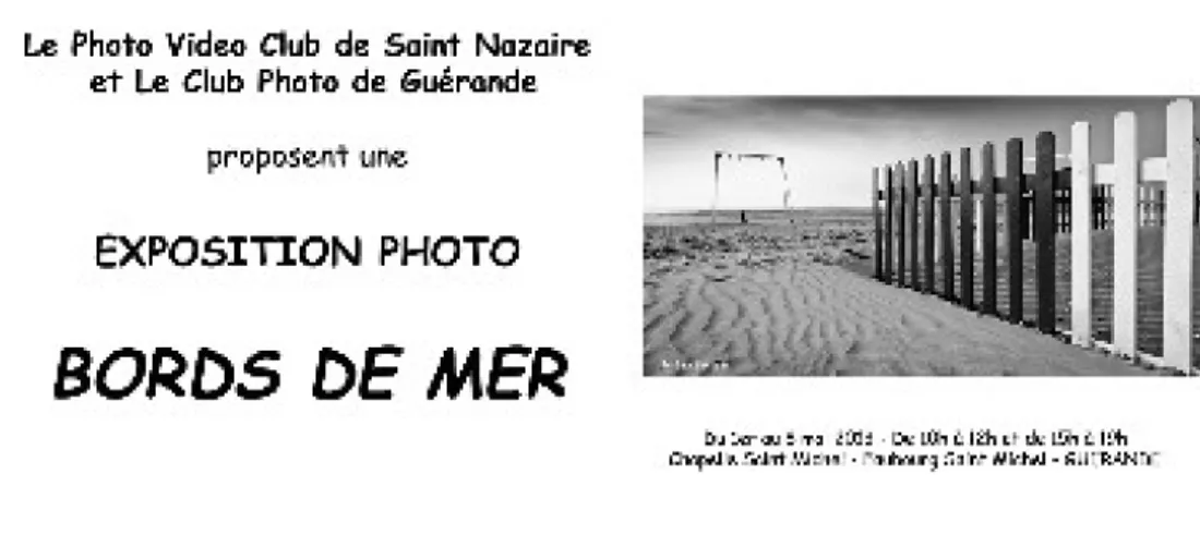 Le Photo Vidéo Club de St Nazaire et le Club Photo de Guérande proposent une exposition photos "Bords de Mer", 120 photos exposées, du 1° au 8 mai, de 10 h à 12 h et de 15 h à 19 h, Chapelle St Michel, Faubourg St Michel, à Guérande. Entrée libre.