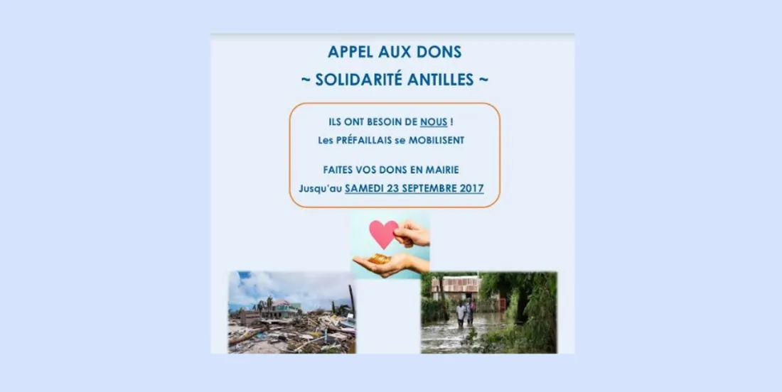 Après le passage de l'ouragan Irma aux Antilles, la solidarité s’organise un peu partout en France. C’est le cas notamment dans la commune de Préfailles. Sur place, les habitants ont décidé d’être solidaires. Si vous souhaitez faire un don, vous pouvez d’ores et déjà vous rendre en mairie, une cagnotte a été mise en place, elle sera ouverte jusqu’au 23 septembre. Et sachez que les fonds récupérés seront entièrement remis à la Fondation de France.